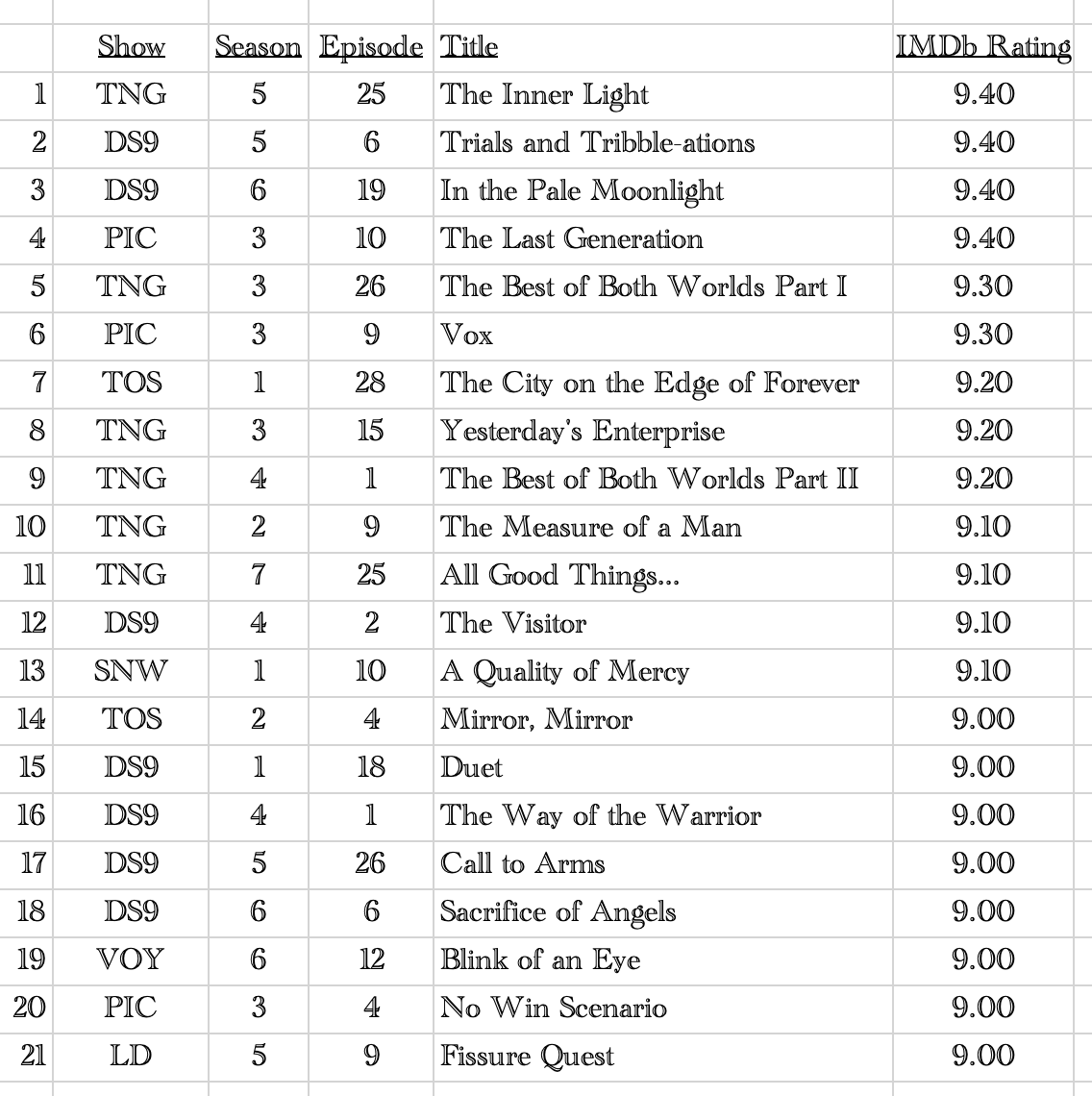 Here are the twenty-one episodes with a 9.0 or higher IMDb rating. (BTW, I realize that if I wanted to be more accurate, I would have grouped the ranking based on tied ratings, but I didn’t have the energy to be that pedantic nor did it occur to me to try and use AI to do so—as such, each tier, i,.e., the 9.4s, are listed chronologically and does not suggest that The Inner Light is better than In the Pale Moonlight).