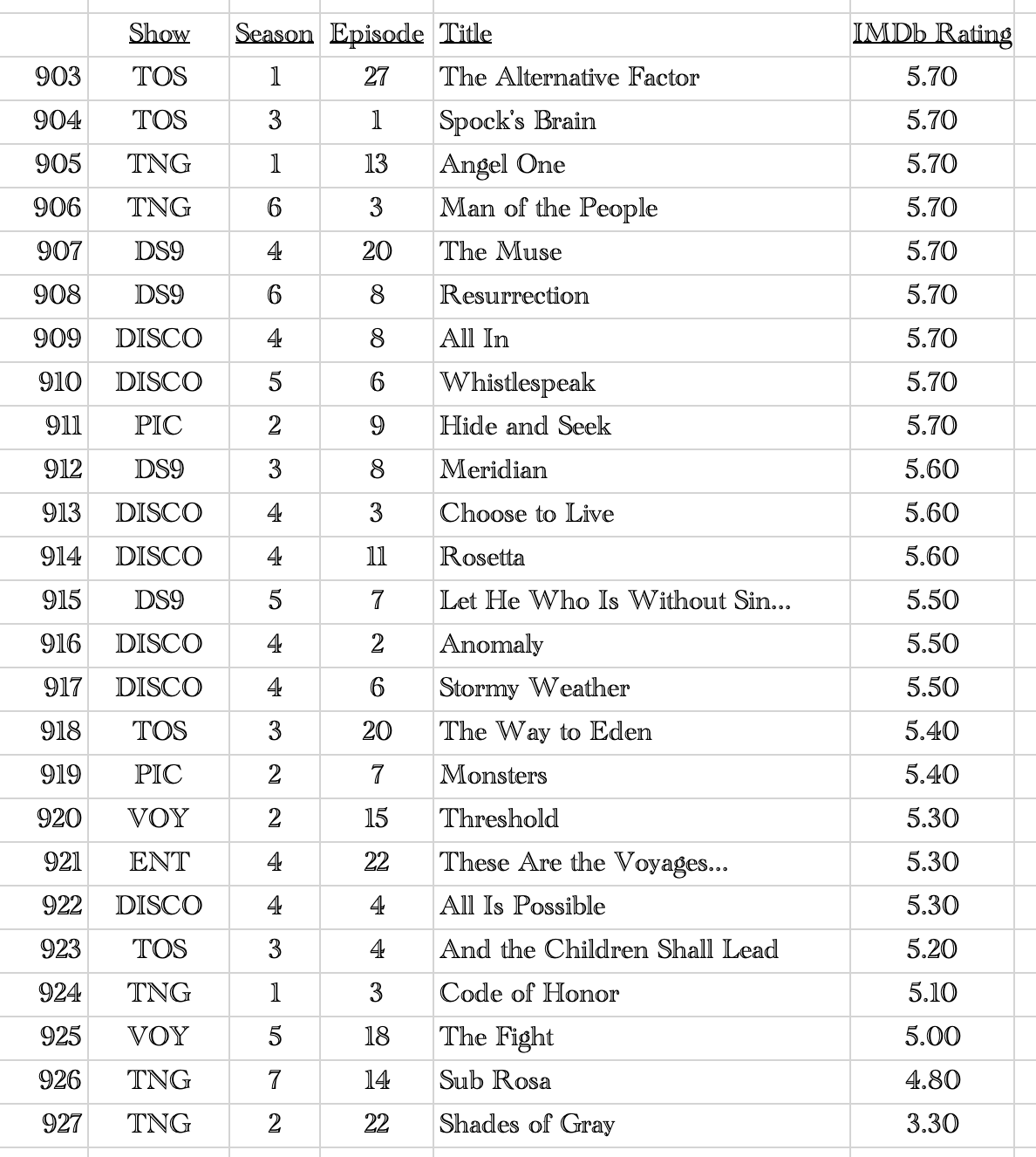 Here, DISCO is the leader in the clubhouse with seven, almost all from the aforementioned and poorly rated s4. Next is TNG with five, TOS and DS9 with four each, two each for PIC and VOY, and 1 for ENT.