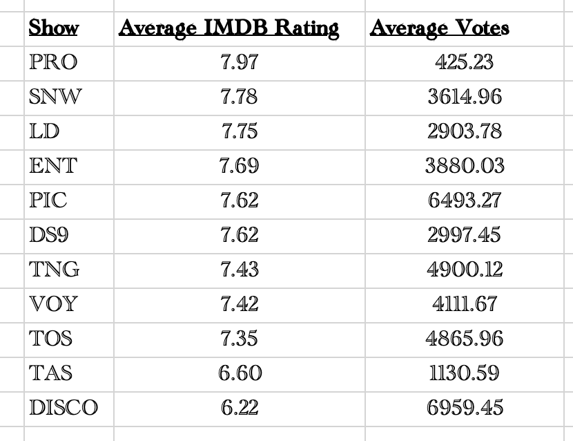 Granted, the range from TOS to PRO is 7.35 to 7.97, or 0.62 points. Not exactly a massive gap! Still, to read all the grievances online about Kurtzman Trek and such, one would have expected TNG, DS9, and VOY to be at the top by a mile!